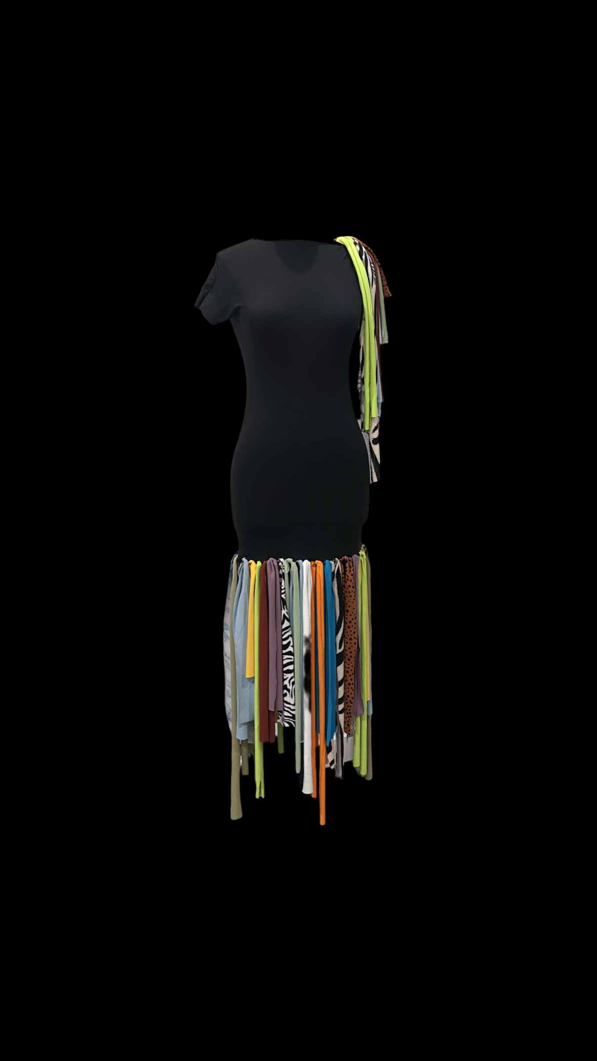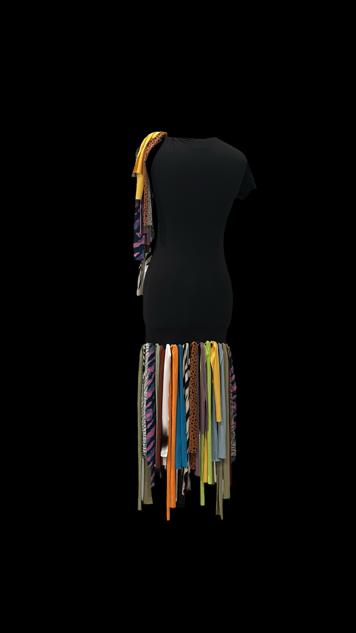 A celebration of movement, color, and individuality. This body-hugging silhouette is adorned with a cascade of hand-tied fabric strips— each one uniquely sourced, stitched with intention, and placed to dance with every step.